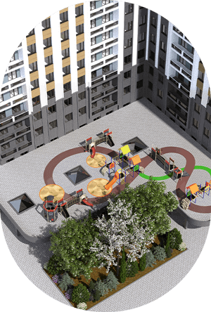 Полноценная инфраструктура с магазинами, кафе, медицинскими клиниками и детской площадкой прямо во дворе.